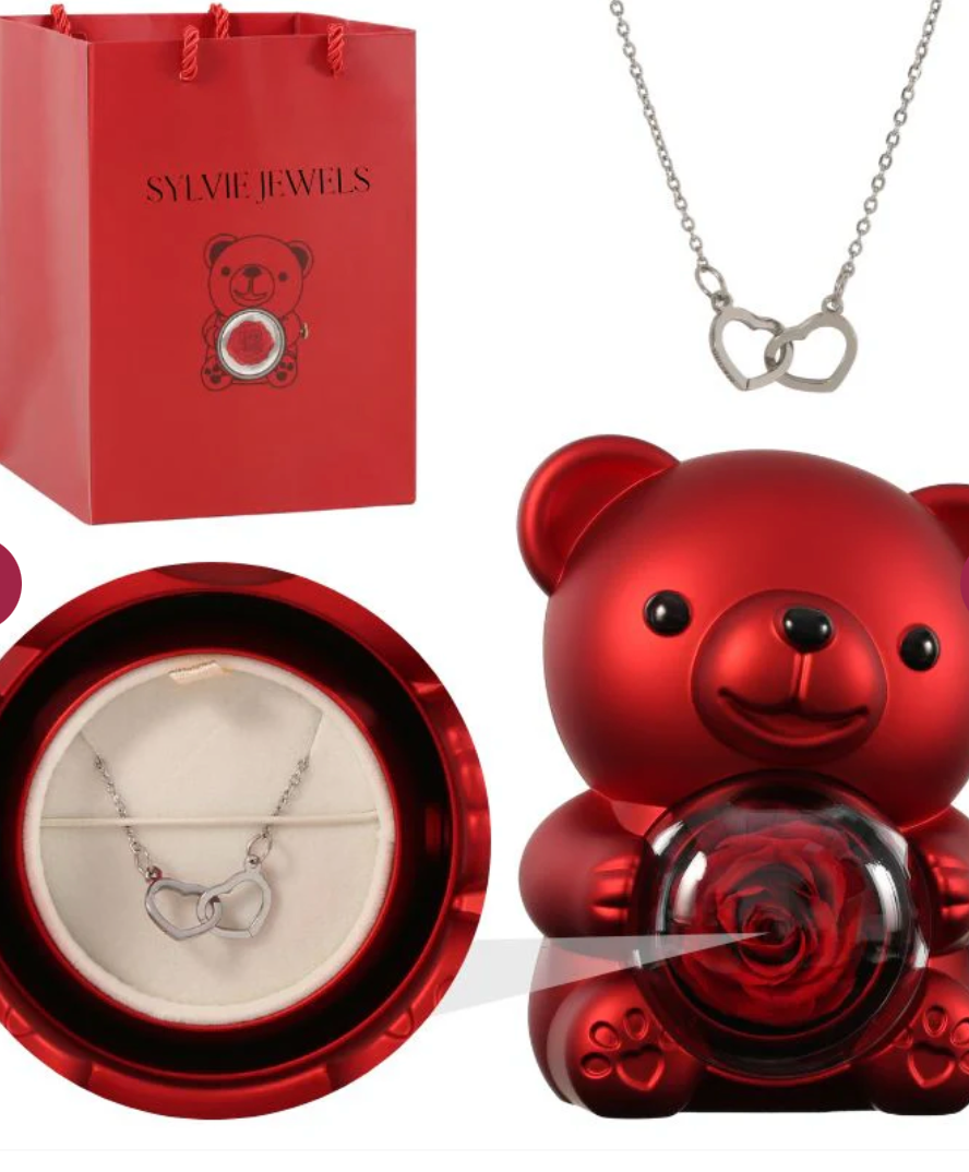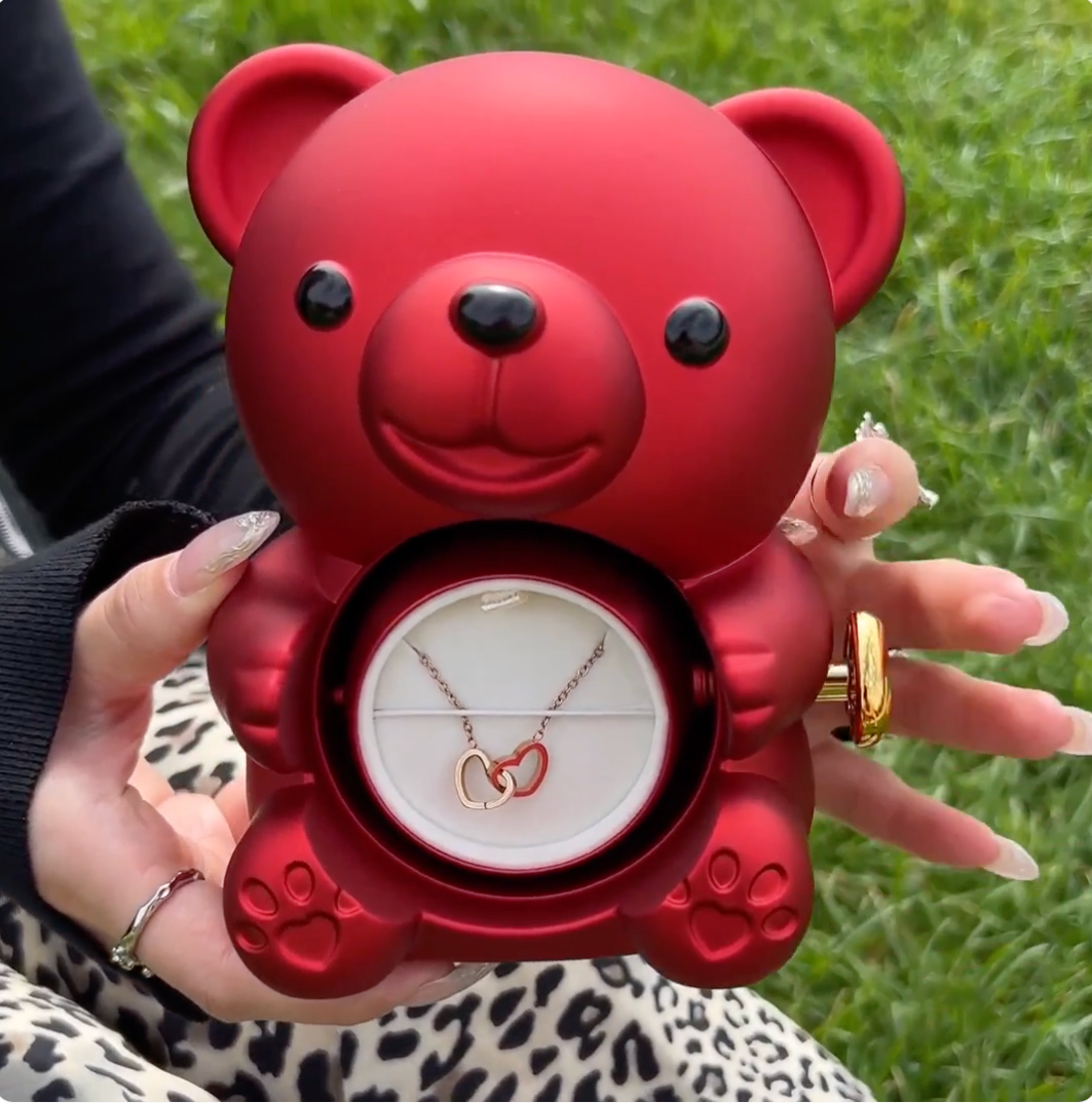 Lleva tu regalo a otro nivel con este exclusivo oso de colección en color rojo mate. Diseñado con una ventana central que exhibe el collar como una joya de arte y una elegante manivela dorada, es el empaque perfecto para quienes buscan sorprender con ternura y sofisticación este San Valentín. ¡Un recuerdo inolvidable que decorará su rincón favorito para siempre! ✨